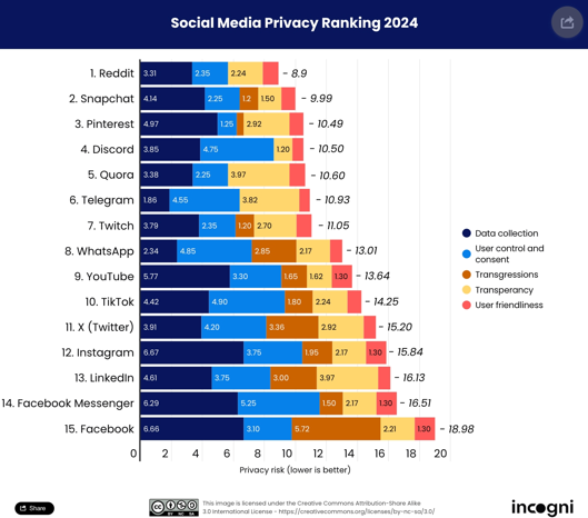 Diğer kategorileri çıkarıp sadece veri toplama tarafına baktığımızda ise farklı bir liste görüyoruz. Burada Telegram en az riskli olmayı başarmış. Onu Whatsapp ve Reddit takip ediyor.
