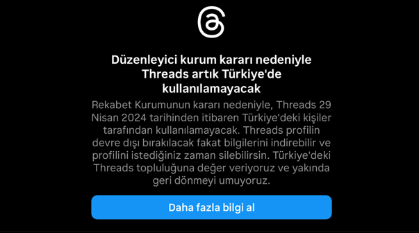 Bu konuda firmadan yapılan açıklamada şöyle denişmişti: “Rekabet Kurumunun (RK) kararına göre Threads, 29 Nisan 2024 tarihinden itibaren Türkiye’deki kişiler tarafından kullanılamayacak. Bu; Türkiye’deki kişilerin Threads uygulamasını indiremeyeceği, Threads’e threads.net adresinden erişemeyeceği, Threads profili oluşturamayacağı veya mevcut Threads profillerini kullanamayacağı anlamına gelmektedir. Bir Threads profili oluşturduysanız ve Türkiye’deyseniz profiliniz dondurulacak ancak silinmeyecektir. Profiliniz dondurulduğunda profiliniz ve profilinizdeki içerikler (örneğin gönderiler, diğer gönderilerle olan etkileşimleriniz) size ve platformdaki diğer kişilere gösterilmeyecektir. Şimdilik profilinizi yeniden etkinleştiremeyeceksiniz. Bu durumun Instagram hesabınızı ve hesabınızın verilerini etkilemeyeceğini unutmayın. Profiliniz dondurulmuş olsa da platform bilgilerinizin bir kopyasını istediğiniz zaman indirebilirsiniz. Platformdaki profilinizi silmeyi de seçebilirsiniz. Not: Birden fazla Threads profili oluşturduysanız ek profillerinizi yönetmek için threads.net adresine gidin. Platformu yakın zamanda Türkiye’ye geri getirmek için çalışıyoruz.”