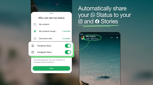 Yapılan resmi açıklamaya göre WhatsApp hesapları yakında Hesaplar Merkezi’ne eklenebilecek. Bu altyapı sayesinde kullanıcılar WhatsApp’ta paylaştıkları ‘durum’ içeriklerinin, otomatik olarak Instagram ve Facebook hesaplarında ‘hikaye’ formatında paylaşılmasını sağlayabilecek. Bu süreci opsiyonel olarak sunan çatı şirket Meta, Hesaplar Merkezi entegrasyonu üzerinden giriş sürecine de hız katacak.